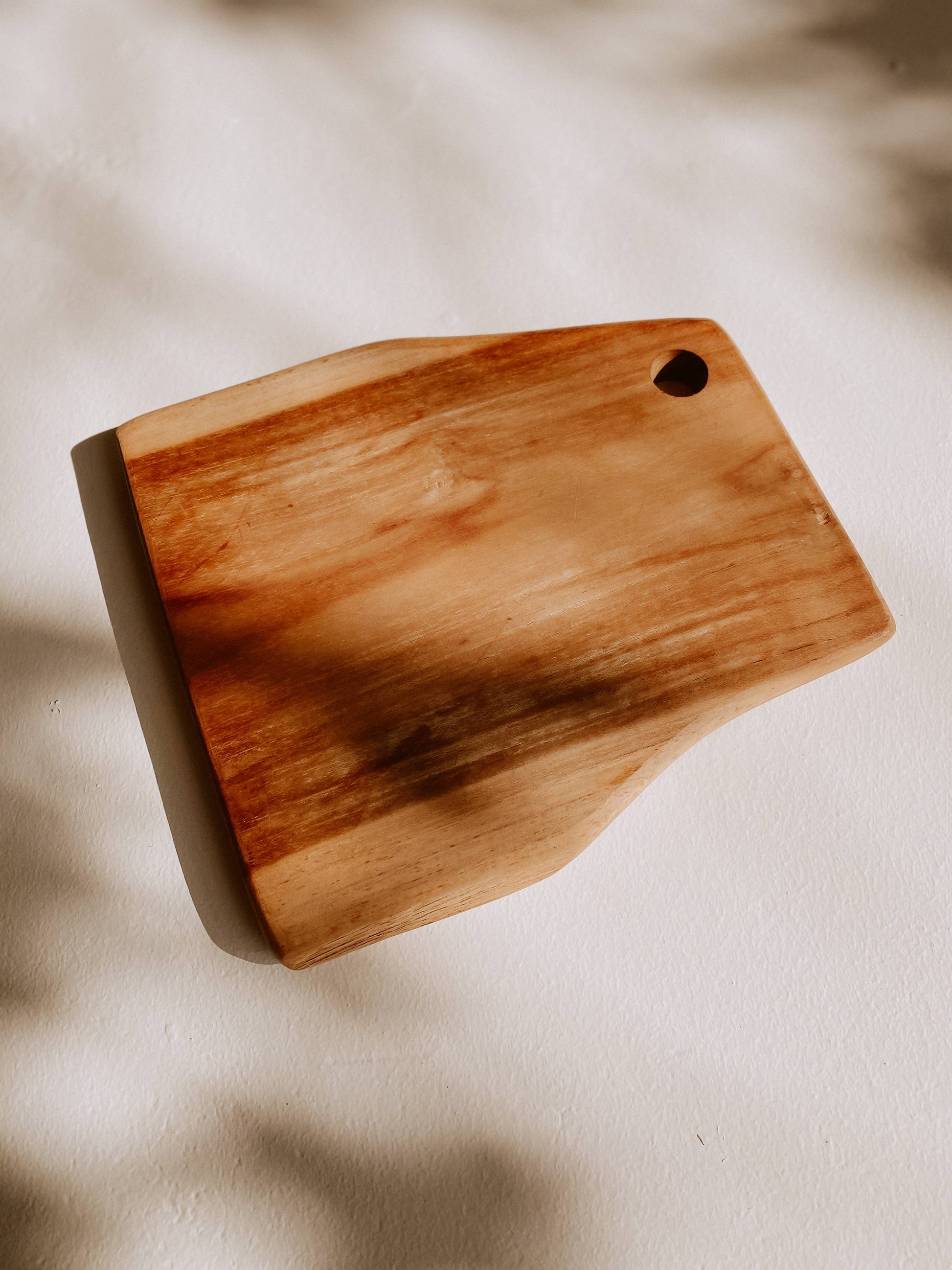 Make a beautiful statement in your kitchen while serving your guests in style. Hand carved from teak in Bali, Indonesia. No two are alike and boast a marbling of rich browns, golden hues, and tans. We love this tropical hardwood so much because it has a built in natural water repellent and is therefore virtually immune to rotting, fungi and harsh chemicals. Also it is one of few hardwoods that can withstand the heat of the desert! Teak wood only grows in three places, one of which is beautiful Indonesia!