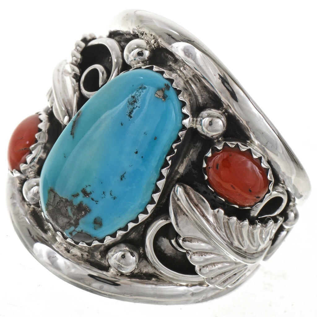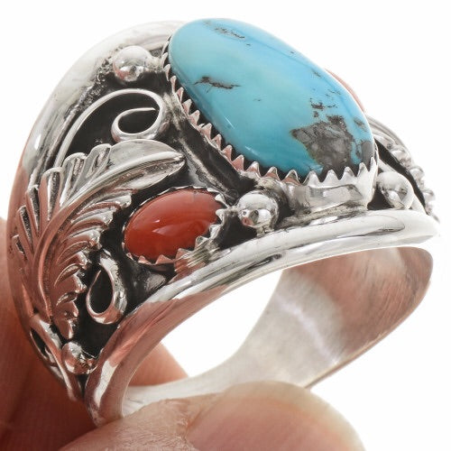 You can’t go wrong with the classic Navajo design and combo of turquoise and red coral. Featuring feather and swirl accents. Handmade with sterling silver stamped sterling and Hallmarked by artist.