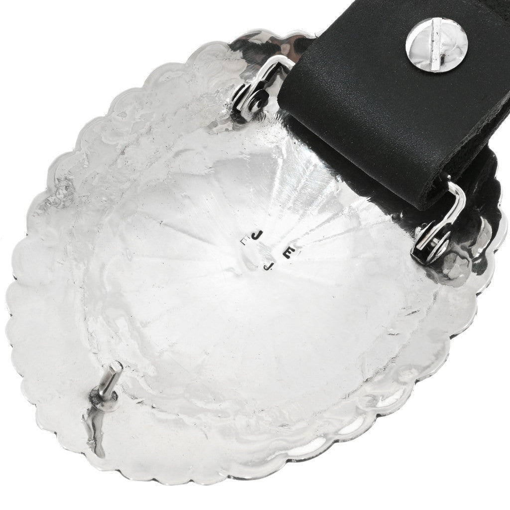 Beautiful Navajo handmade black onyx and nickel silver concho belt. Includes six 3” x 2.5” oval conchos and seven 2” x 1 1/8” butterfly conchos on your choice of 1 1/8”” wide black or brown leather. The buckle is 4” x 3” and features a black onyx center gemstone. Navajo handmade and hallmarked.
