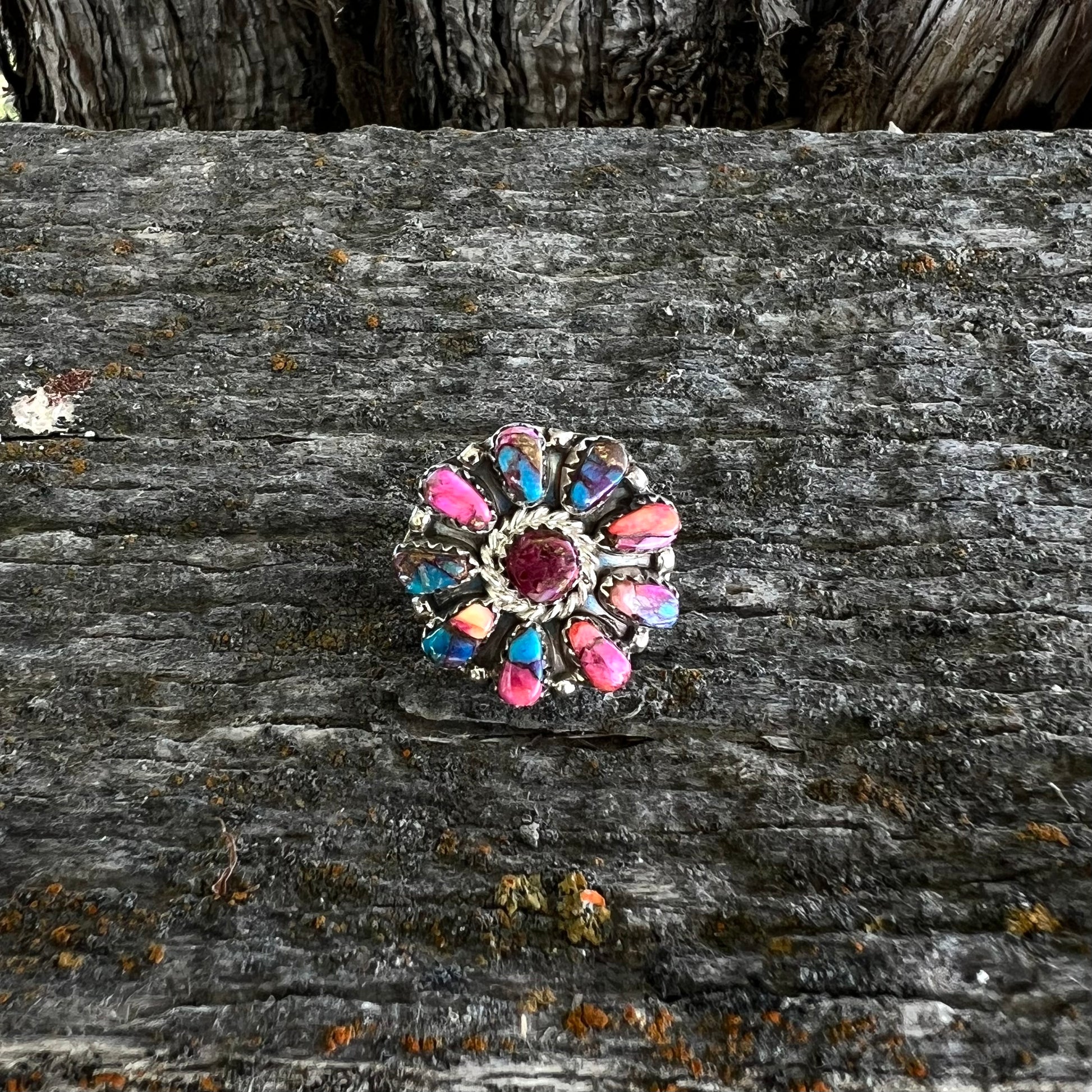 Navajo handmade Pink Dahlia adjustable cluster ring