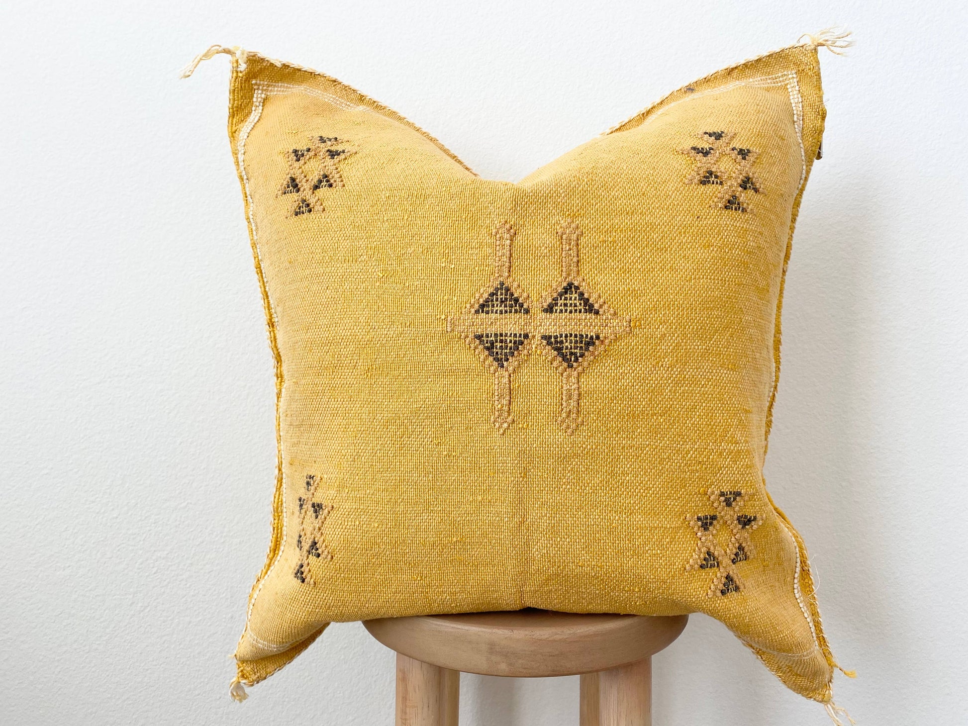These one-of-a-kind Sabra's have a bright yellow hue, crafted from 100% vegan Agave Cactus Plant silk. Hand-stitched embroidery means every pillow is unique - you can expect slight variations in color, spots, and markings, adding to its vintage character. We suggest using a 20" x 20" Down pillow insert for best results, but note that it's not included. To keep your Sabra looking spiffy, dry clean only!
