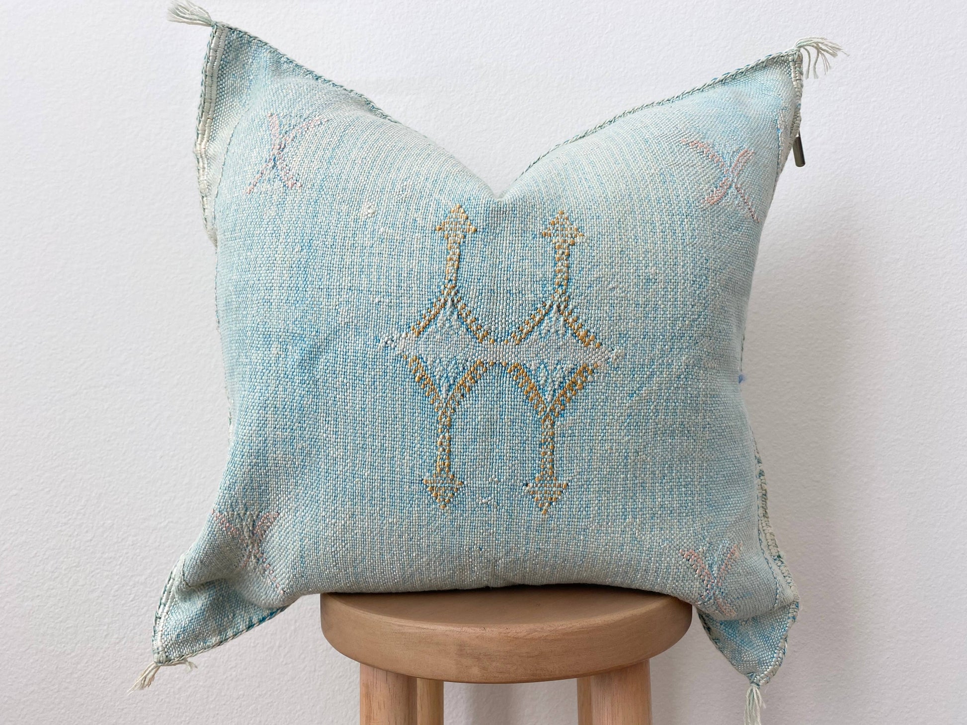 These one-of-a-kind Sabra's have a beautiful turquoise blue hue, crafted from 100% vegan Agave Cactus Plant silk. Hand-stitched embroidery means every pillow is unique - you can expect slight variations in color, spots, and markings, adding to its vintage character. We suggest using a 20" x 20" Down pillow insert for best results, but note that it's not included. To keep your Sabra looking spiffy, dry clean only!