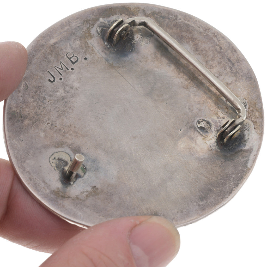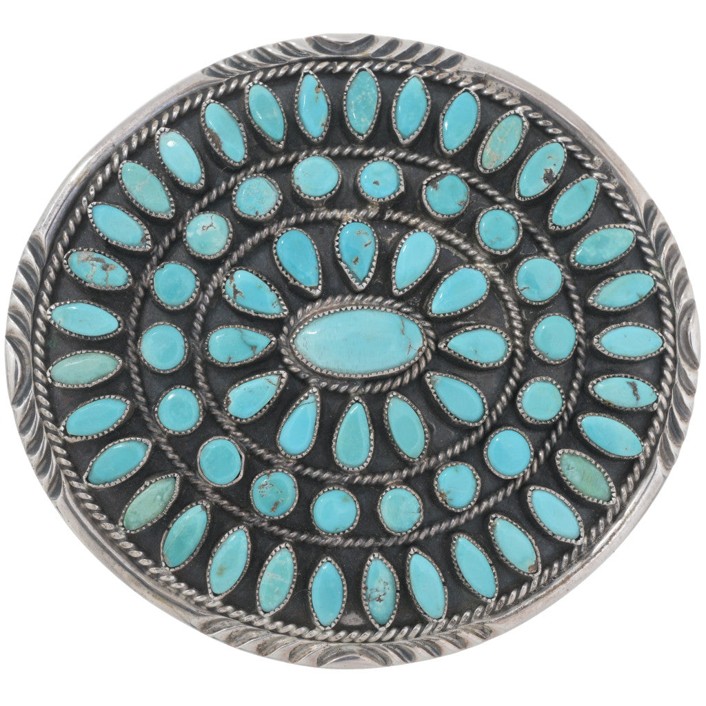 This vintage belt buckle is handcrafted with natural turquoise teardrops, rounds, and ovals, set in sterling with beautiful patina. The traditional design is timeless and measures 3” by 2 3/4” with a 1 1/2” keeper. It's in very good used condition. Made by Johnny Mike Begay (1933-1976), an award-winning Navajo artisan whose work was showcased in “Jewels of the Southwest” at the Museum of Indian Arts and Culture in Santa Fe in 2002.