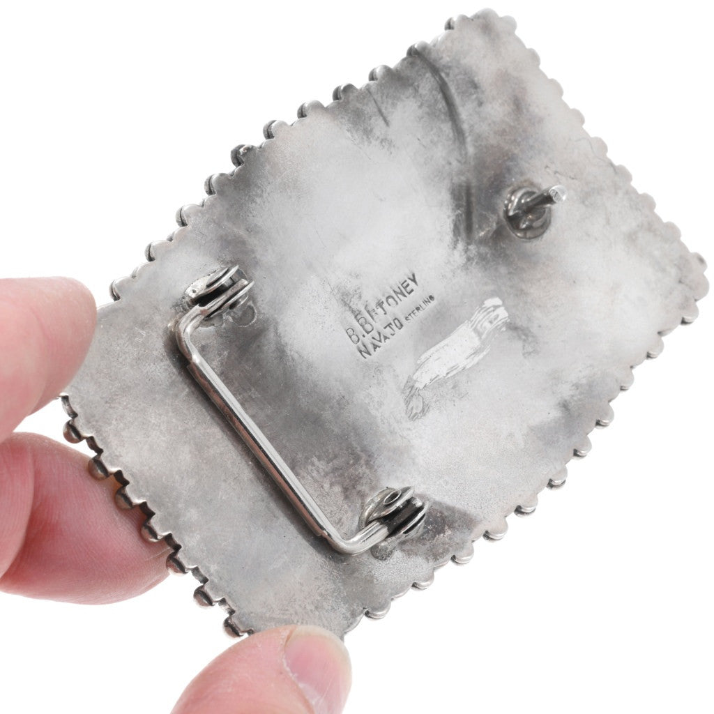 This Vintage Zuni Needlepoint Turquoise Belt Buckle exhibits both Zuni and Navajo techniques, carefully and skillfully crafted. Each Sleeping Beauty Turquoise stone is expertly bezel-set with delicate twist wire accents and elevated geometric silver designs. The finishing touch of small dot edging complements the 3-1/2" by 2-1/2" design, complete with a 1-1/2" keeper. This piece is in excellent, used condition, stamped with the Sterling mark and hallmarked by esteemed silversmith B Betoney (Bill Betoney). Perfectly combining style, stone, and metal, this belt buckle is a must-have for any fashion-forward individual.